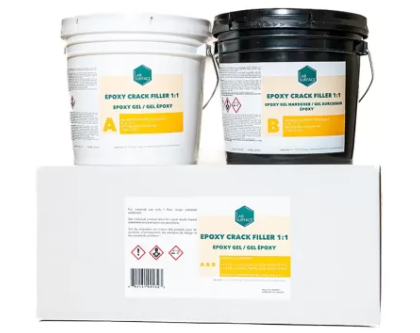 The EPOXY CRACK FILLER is a 100% solids two-component (1A:1B) gel epoxy crack repair which is virtually VOC-free. The product is easy to use and can be applied on horizontal and vertical surfaces. It also offers a long pot life and working time but cures very quickly allowing the installation of the base coat or primer 60 minutes after the application of the EPOXY CRACK FILLER. This product possesses superior mechanical and chemical properties suited for residential, commercial and industrial applications. The formulation is based on a high-performance cycloaliphatic polyamine technology displaying outstanding properties.