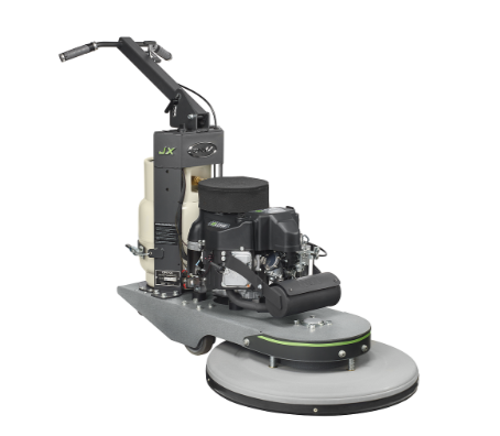JX Propane Burnishers are designed for speed and safety. Available in 21", 24", or 27" sizes, JX machines burnish vinyl tile, terrazzo, and concrete floors up to 35,000 sqft per hour. The patented floating shroud eliminates airborne dust keeping store shelves clean and operators safe. The patented variable jet fuel system reduces emissions and is certified as 53% cleaner than any engine in its class.